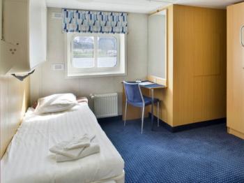 シングルキャビン部屋の広さ: 約9㎡ / シングルベッド/シャワー/トイレ/洗面台/クローゼット/ライティングデスク/椅子/エアコン/ヘアドライヤー/バスローブ/シャンプー/リンス/ボディソープ -