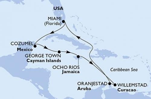 〈主要な寄港地〉 マイアミ / コスメル / ジョージタウン / オーチョリオス / ウィレムスタード / オランヘスタード / オーシャンケイのMSC海洋保護区