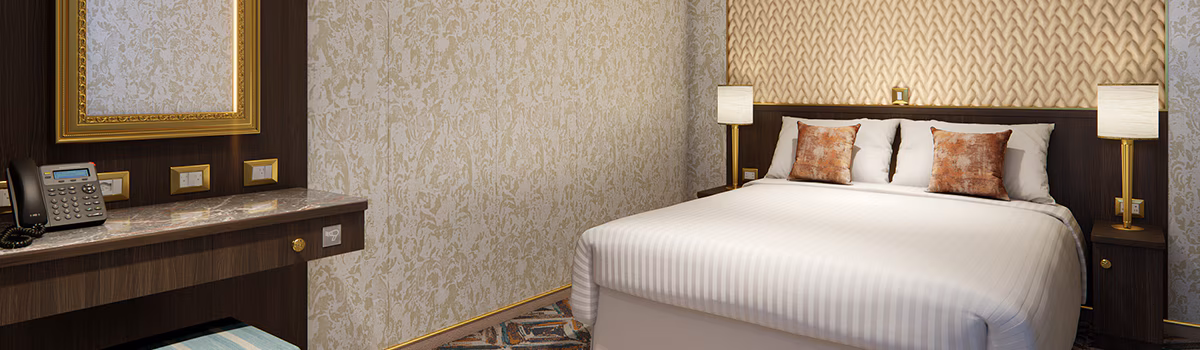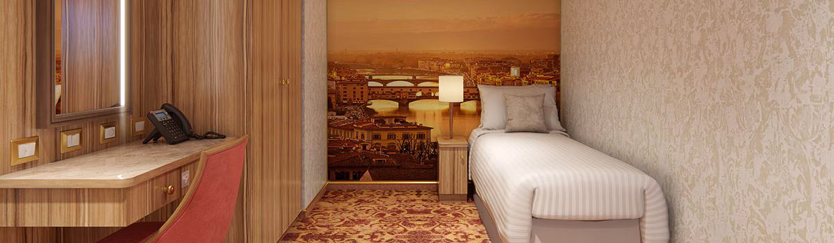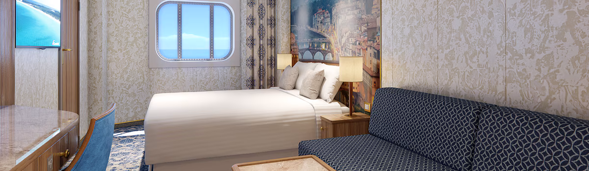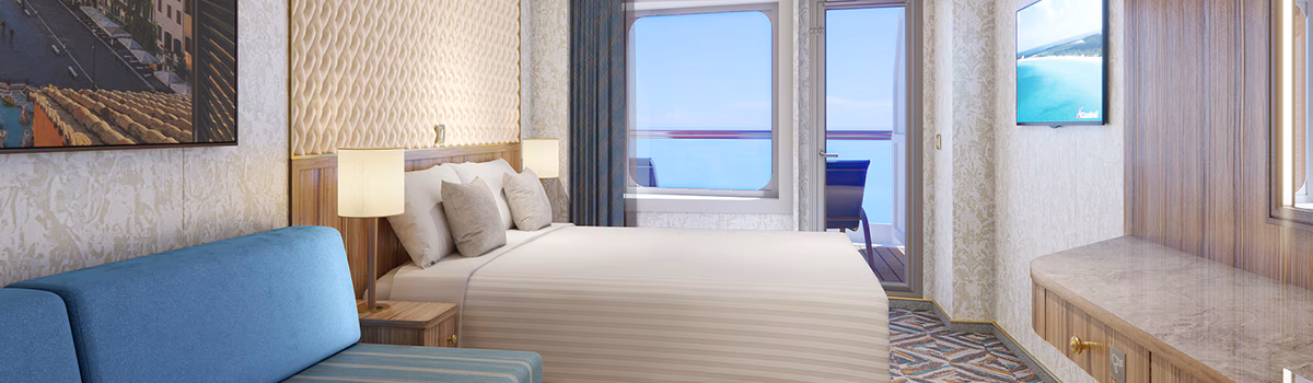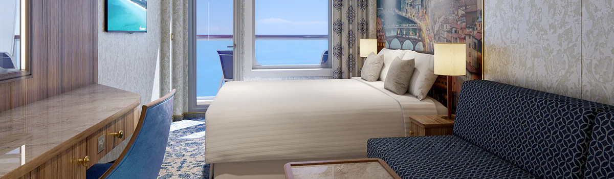 テラッツァインテリア/ イタリアのセンスで飾られた居心地の良いクラシックなステートルーム...さらに、プライベートデッキへの独占的なアクセスなどの設備は、素晴らしいドリンク、エンターテイメント、ジャグジーなどを終日楽しめます。(テラッツァのステートルームのゲストは12歳以上である必要があります。 -