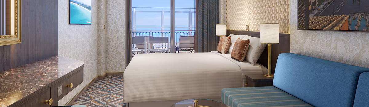 テラッツァ プレミアム ビスタ バルコニー/ クルーズ中にテラッツァの生活を送りたいなら...私たちはあなたのスタイルが好きで、あなたのための部屋を用意しています。内側にはイタリアのセンスがたくさんありますが、外側のものも重要です。そしてこの場合、それは海風を感じながら豪華なプライベートラウンジのための信じられないほどのラップアラウンドバルコニーです。しかし、ここですべての時間を費やす必要はありません:また、素晴らしいドリンク、エンターテイメント、ジャグジーなどで終日くつろぐことができるプライベートデッキであるTerrazza Modaへの独占的なアクセスもあります。(テラッツァのステートルームのゲストは12歳以上である必要があります。 -
