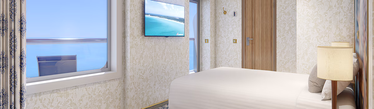 コーブバルコニー/ コーブバルコニーのステートルームは喫水線に近づき、船がクルーズする際の航跡と海の泡の素晴らしい景色を間近で見ることができるバルコニーを備えています。 -