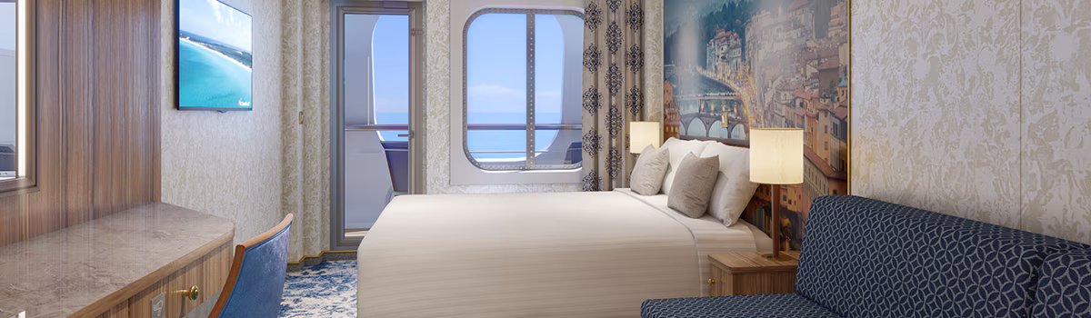 バルコニー/ バルコニーのステートルームは、海風を最大限に受け、最も素晴らしい景色を楽しめるように設計されています。景色を眺めながらクルーズし、あなた自身の個人的な屋外オアシスからすぐのところにあります。 -
