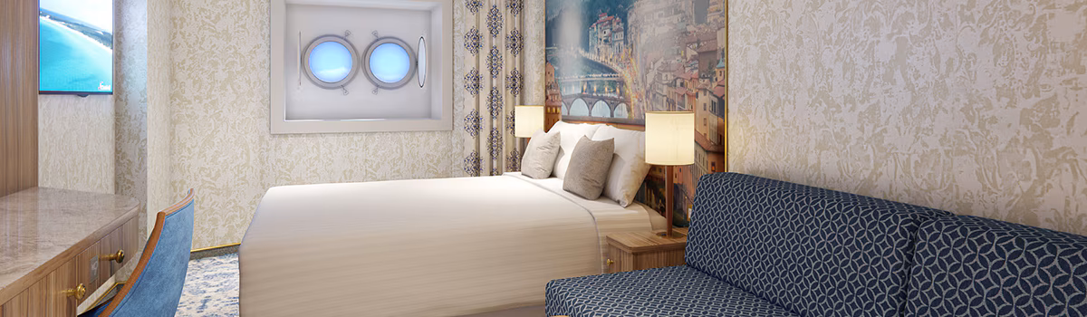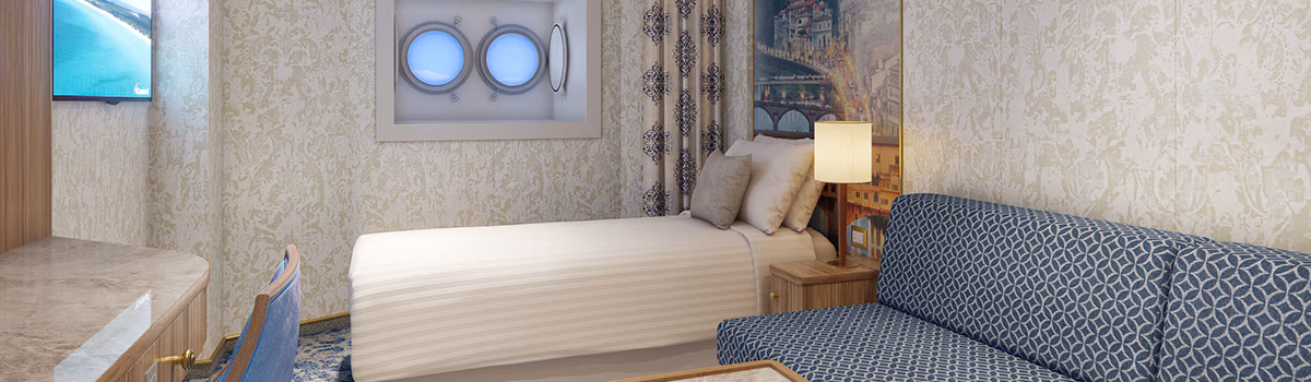 舷窓付きインテリアアッパー/ロア/ これらのステートルームは、予算内でクルーザーのペアに最適で、ツインベッド1台、プルマンベッドまたはソファベッド1台など、異なるレイアウトでスペースを創造的に最大化し、さらに丸い窓から海の景色を眺めることができます。 -