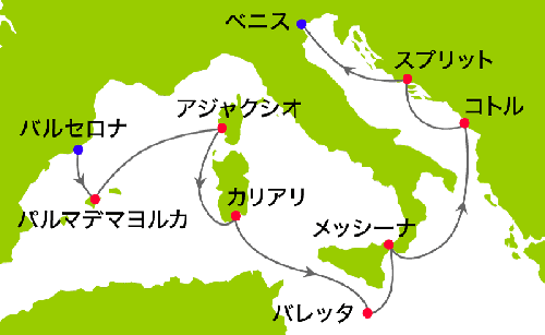 バルセロナ / マルセイユ / ジェノバ / チビタベッキア/ローマ / メッシーナ(シチリア島) / バレッタ