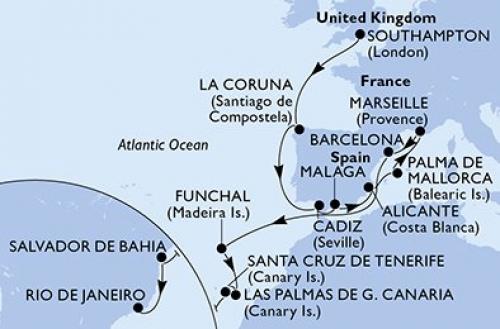 〈主要な寄港地〉 サウサンプトン / ラコルーニャ / カディス / マラガ / アリカンテ / パルマデマヨルカ / マルセイユ / バルセロナ / フンシャル(マディラ島) / ラスパルマス / サンタ・クルス・デ・テネリフェ / サルバドール / リオデジャネイロ