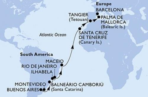 〈主要な寄港地〉 マイアミ /  オーチョリオス /  オランヘスタード /  カルタヘナ /  コロン /  ロアタン /  オーシャンケイのMSC海洋保護区 /  ロードタウン /  サンタ・クルス・デ・テネリフェ /  バルセロナ