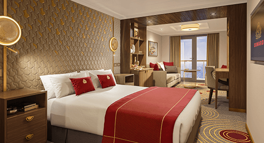 グランド・ロビー船内の中心にあり、お客様が頻繁に立ち寄る場所であるため、エネルギーと光に満ちたエントランスとなるようデザインされています。過去から現在への移り変わりを表現するこのエリアには、アールデコを基調とした「旅の黄金時代」へのオマージュとして、照明効果によって一日中違った姿を見せる現代的なミューラル(壁画)が設置されています。デッキ1からデッキ3の上まで、いくつもの真鍮板(しんちゅうばん)が並び、後ろから照明を当てると船の形が浮き上がります。一日のうち照明を当てる時間を変えることで、昼と夜で違った雰囲気を醸し出します。ゴールデン・ライオン店内へ入った瞬間、ゴールドの光に包まれる温かみのある空間。伝統的なパブでありながら、芸術品、建築ディテールを盛り込み、独特な英国の雰囲気を演出しています。ゴールデン・ライオンを含め、クイーン・アンの船内には15軒のレストランをご用意し、世界各国の料理をご堪能いただけます。クイーンズ・ルーム昼夜問わず様々なイベントが行われるボールルームです。