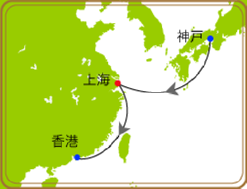 神戸 / 横浜 / 鹿児島 / 宮古島 / 香港 / ハロン湾 / ダナン / ホーチミン / シアヌークビル / シンガポール / バンダルスリブガワン / コタキナバル(ボルネオ島) / 那覇 / 横浜 / 神戸