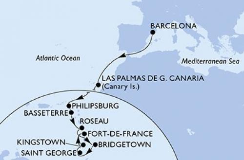 〈主要な寄港地〉 バルセロナ / ラスパルマス / フィリップスバーグ / バセテール / ロゾー / ブリッジタウン / セント・ジョージズ / キングスタウン / フォール=ド=フランス