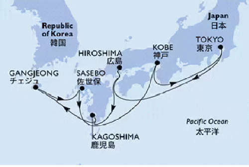 〈主要な寄港地〉 香港 / 高雄 / フアヒネ島 / 石垣島 / 奄美大島(鹿児島) / 油津(宮崎) / 別府 / 関門海峡 / 釜山 / 金沢(石川県) / 秋田 / 青森 / 東京