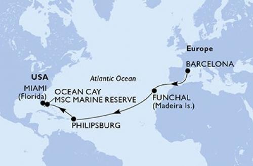 〈主要な寄港地〉 ポート・カナベラル / ナッソー / オーシャンケイのMSC海洋保護区 / アンバーコーブ / マイアミ / フィリップスバーグ / フンシャル(マディラ島) / バルセロナ