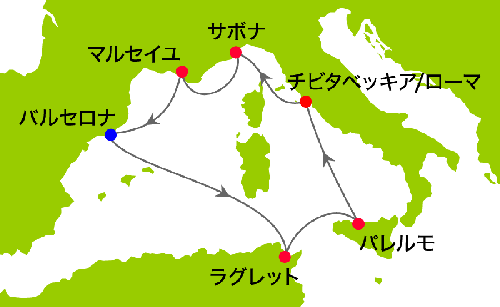 〈主要な寄港地〉 チビタベッキア/ローマ /  サボナ /  マルセイユ /  バルセロナ /  ラグレット /  パレルモ