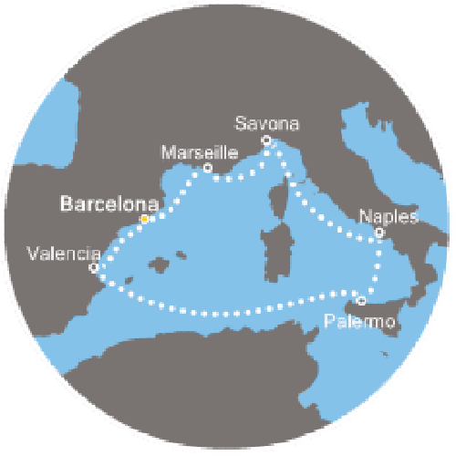 バルセロナ / マルセイユ / ジェノバ / チビタベッキア/ローマ / メッシーナ(シチリア島) / バレッタ