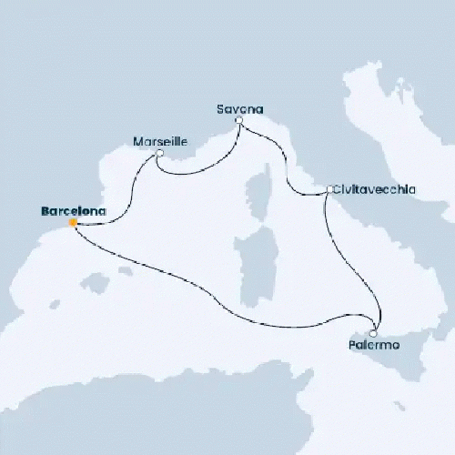 | 2 | バルセロナ空港到着、空港よりご自身にて、港へ チェックイン後、乗船 バルセロナ港、出港 | - | 17:30 | 船内泊 |