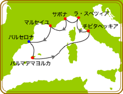 バルセロナ / マルセイユ / ジェノバ / チビタベッキア/ローマ / メッシーナ(シチリア島) / バレッタ