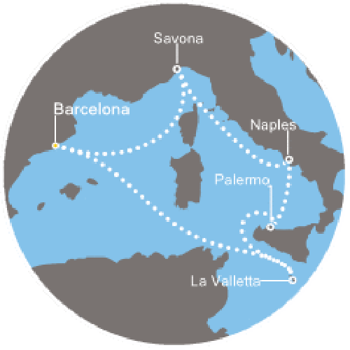 バルセロナ / イビサ / カリアリ(サルディニア島) / チビタベッキア/ローマ / ジェノバ / マルセイユ / リボルノ/フィレンツェ / バレンシア