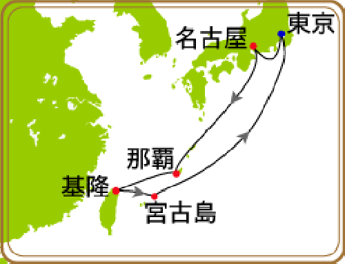 東京 / 清水 / 神戸 / 高知 / 細島 / 別府 / 関門海峡 / 長崎 / カコトック / 仁川<インチョン> / 鹿児島 / 那覇 / 宮古島 / 台湾(基隆)