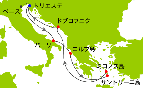 09:00 トリエステ(イタリア)入港 下船後、ベニス空港へ ベニス発、カタール航空乗継便にて帰国の途へ |