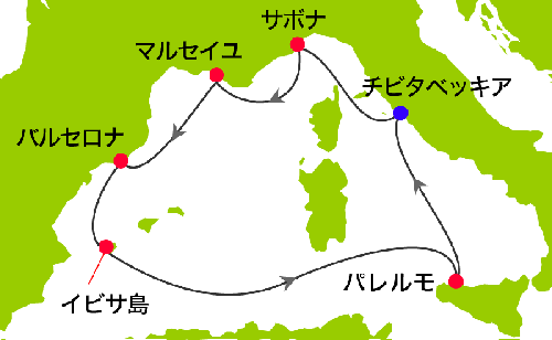 ローマ着後、送迎車にてチビタベッキア港へ 着後、『コスタ スメラルダ』乗船手続き 19:00 チビタベッキア(イタリア)出港 |