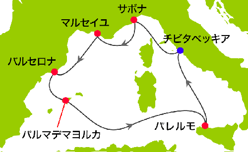 ◎大聖堂 ◎ベルベル城18:00 パルマデマヨルカ(スペイン)出港 |