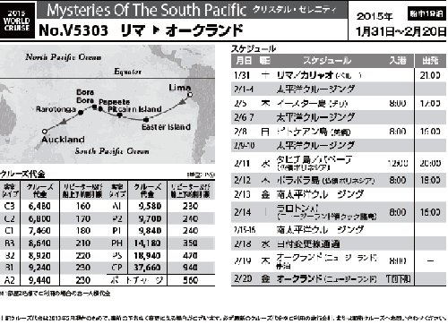 パンフレットで日程と寄港地を見る ➤リマ/カリャオ→イースター島→ピトケアン島→タヒチ島/パペーテ→ボラボラ島→ラロトンガ→オークランド★