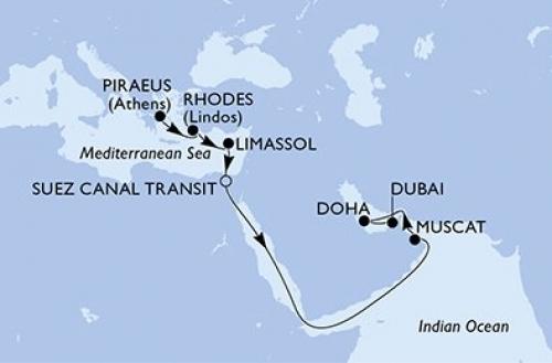 〈主要な寄港地〉 バルセロナ / マルセイユ / ジェノバ / チビタベッキア/ローマ / バレッタ / アテネ/ピレウス / ロードス島 / リマソール / スエズ運河 / マスカット / ドーハ / ドバイ / シルバニヤス島 / アブダビ