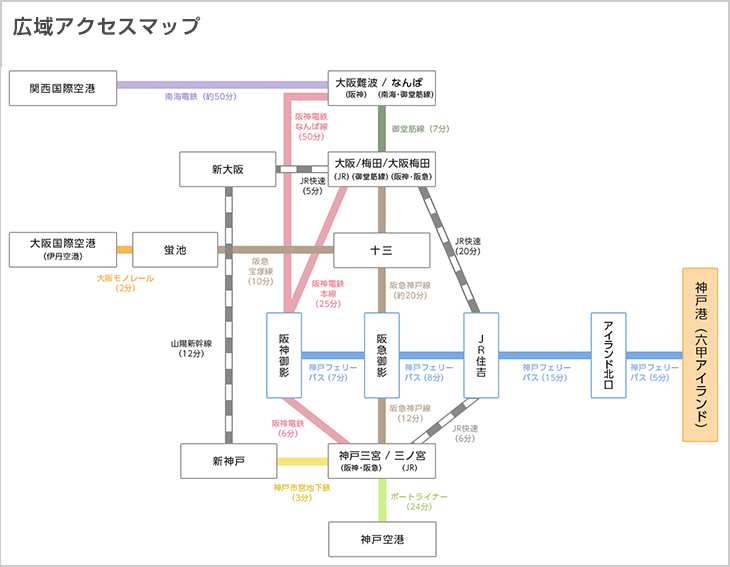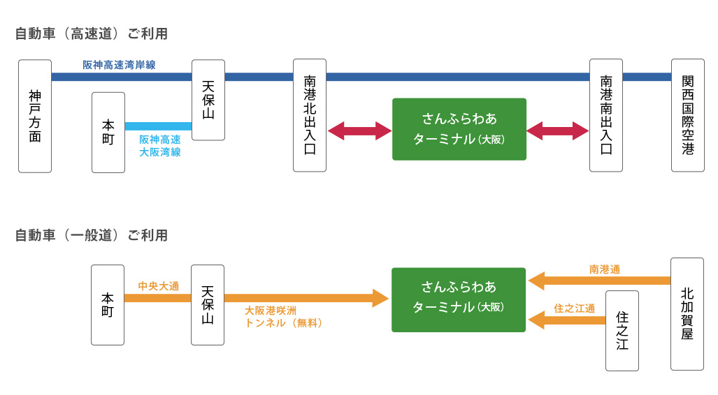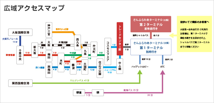 大阪モノレール経由、Osaka Metro御堂筋線「本町」で中央線に乗り換え、コスモスクエア経由で約60分 - 第1ターミナル⇔第2ターミナル シャトルバス乗り場