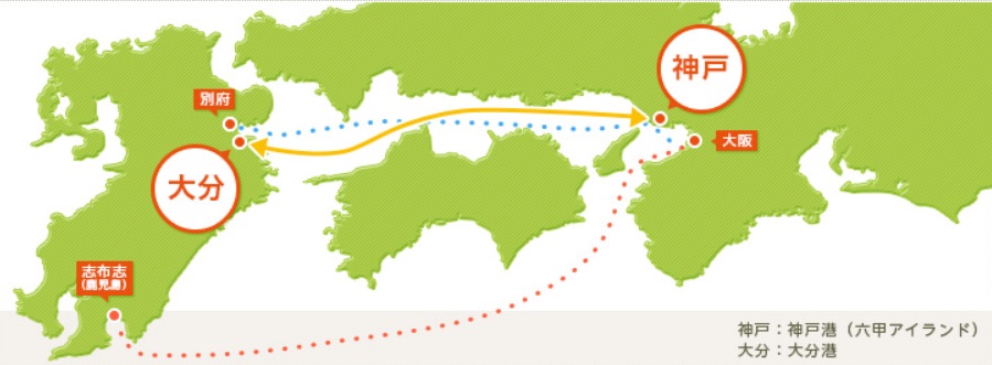日曜日~木曜日:神戸 19:00発 >> 大分 翌朝 06:20着
