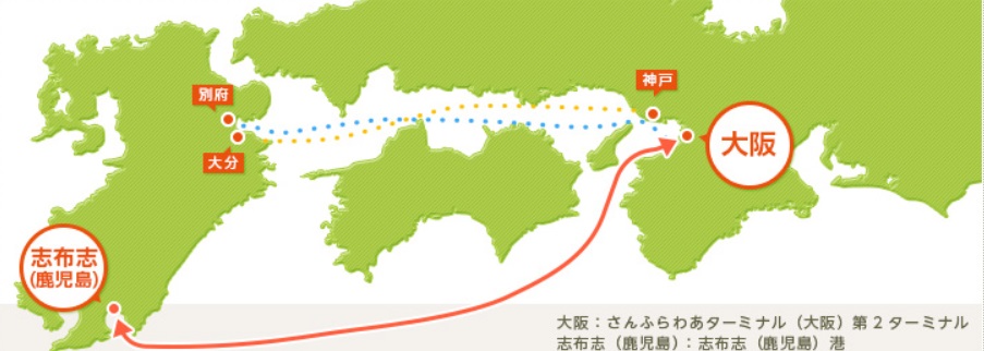 金曜日 :大阪 17:55発 >> 志布志(鹿児島) 翌朝 07:50着