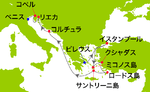 イスタンブール / ディキリ/トルコ / イズミール / メッシーナ(シチリア島) / ナポリ / リボルノ/フィレンツェ / ヴィルフランシュ=シュル=メール / マルセイユ / バルセロナ