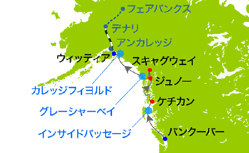 ※クルーズ中の寄港地観光・オプショナルツアー、および、9日目ウィッティア港~13日目フェアバンクス空港間の、列車を含む移動・観光はホーランド・アメリカ・ラインの主催となり、混乗車の利用となります。