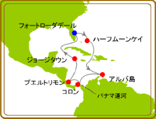 | 6 | (火) | ウィレムスタッド(蘭領キュラソー) | 08:00 | 16:00 | ○ | ○ | ○ | 船内泊 |