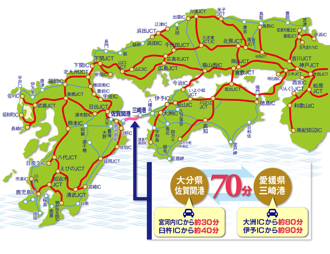 佐賀関から佐多岬半島の先端、三崎まで九州・四国間の最短航路(31㎞)を、わずか70分で結びます。