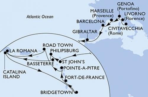 〈主要な寄港地〉 チビタベッキア/ローマ / リボルノ/フィレンツェ / ジェノバ / マルセイユ / バルセロナ / ジブラルタル海峡 / セントジョンズ / フィリップスバーグ / バセテール / ラ・ロマーナ / カタリナ島 / ブリッジタウン / フォール=ド=フランス / ポワンタピートル / ロードタウン