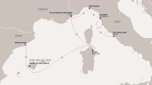〈主要な寄港地〉 チビタベッキア/ローマ / リボルノ/フィレンツェ / ジェノバ / ポルトフィーノ / ヴィルフランシュ=シュル=メール / オルビア / パルマデマヨルカ / バルセロナ