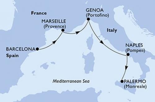 主な寄港地:バルセロナ / マルセイユ / ジェノバ / チビタベッキア/ローマ / メッシーナ(シチリア島) / バレッタなど