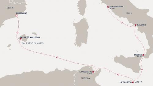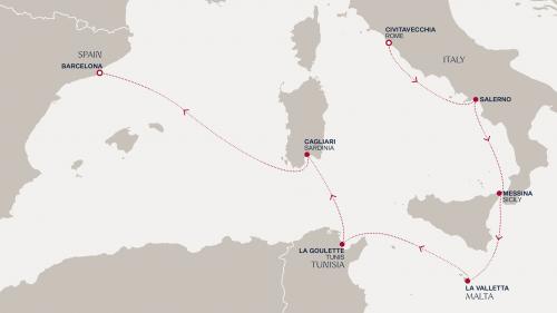 主な寄港地:バルセロナ / マルセイユ / ジェノバ / ナポリ / メッシーナ(シチリア島) / バレッタなど