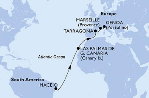 〈主要な寄港地〉 リオデジャネイロ / マセイオ / ラスパルマス / タラゴナ / マルセイユ / ジェノバ / チビタベッキア/ローマ / パレルモ / イビサ / バレンシア
