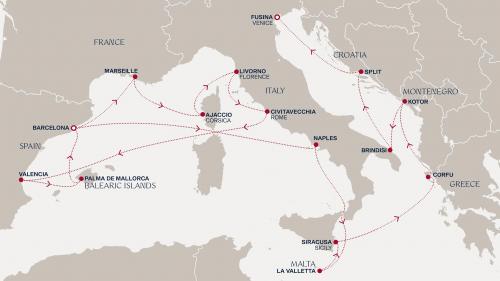 〈主要な寄港地〉 バルセロナ / マルセイユ / コルシカ島 / リボルノ/フィレンツェ / チビタベッキア/ローマ / バレンシア / パルマデマヨルカ / ナポリ / バレッタ / シラクサ/シチリア島 / コルフ島 / コトル / ブリンディジ / スプリット / ベニス