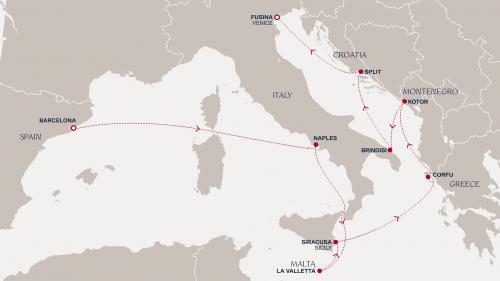 主な寄港地:バルセロナ / マルセイユ / ジェノバ / ナポリ / メッシーナ(シチリア島) / バレッタなど