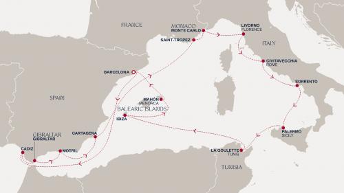 〈主要な寄港地〉 バルセロナ / カディス / ジブラルタル海峡 / モトリル / カルタヘナ / サントロペ / モンテカルロ / リボルノ/フィレンツェ / チビタベッキア/ローマ / ソレント / パレルモ / ラグレット / イビサ / マホン