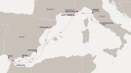〈主要な寄港地〉 バルセロナ / カディス / ジブラルタル海峡 / モトリル / カルタヘナ / サントロペ / モンテカルロ / リボルノ/フィレンツェ / チビタベッキア/ローマ