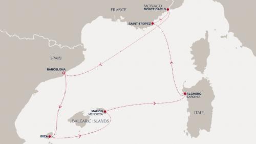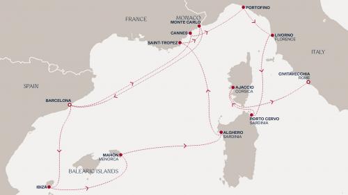 〈主要な寄港地〉 バルセロナ / イビサ / マホン / アルゲーロ(サルディニア島) / サントロペ / モンテカルロ / カンヌ / ポルトフィーノ / リボルノ/フィレンツェ / ポルト・チェルヴォ / コルシカ島 / チビタベッキア/ローマ