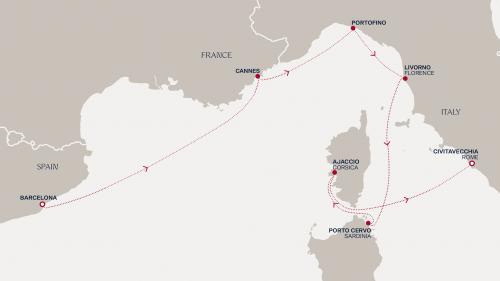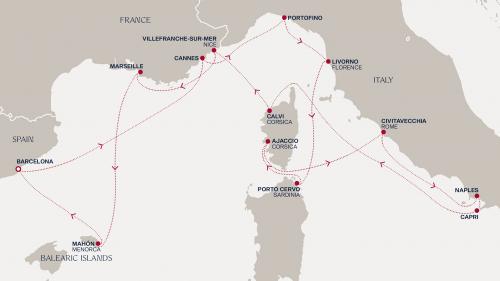 〈主要な寄港地〉 バルセロナ / カンヌ / ポルトフィーノ / リボルノ/フィレンツェ / ポルト・チェルヴォ / コルシカ島 / チビタベッキア/ローマ / ナポリ / カプリ島 / カルヴィ/コルシカ島 / ヴィルフランシュ=シュル=メール / マルセイユ / マホン