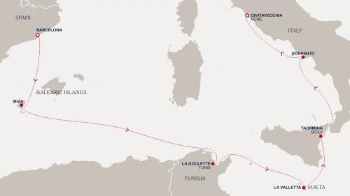 〈主要な寄港地〉 バルセロナ / イビサ / ラグレット / バレッタ / タオルミーナ/シチリア島 / ソレント / チビタベッキア/ローマ / モンテカルロ / サントロペ / バレンシア / マホン