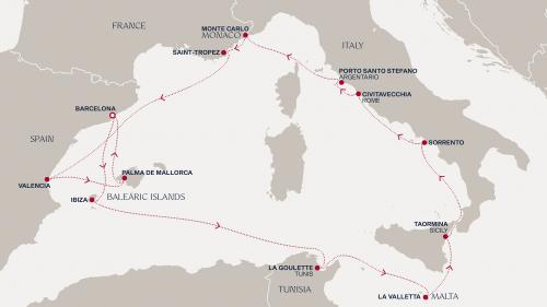 〈主要な寄港地〉 バルセロナ / イビサ / ラグレット / バレッタ / タオルミーナ/シチリア島 / ソレント / チビタベッキア/ローマ / モンテカルロ / サントロペ / バレンシア / パルマデマヨルカ