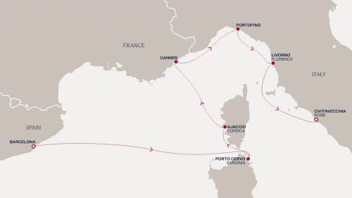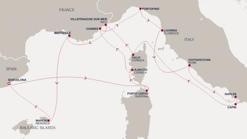 〈主要な寄港地〉 バルセロナ / ポルト・チェルヴォ / コルシカ島 / カンヌ / ポルトフィーノ / リボルノ/フィレンツェ / チビタベッキア/ローマ / ナポリ / カプリ島 / カルヴィ/コルシカ島 / ヴィルフランシュ=シュル=メール / マルセイユ / マホン