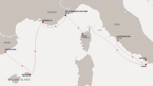 〈主要な寄港地〉 チビタベッキア/ローマ / ナポリ / カプリ島 / カルヴィ/コルシカ島 / ヴィルフランシュ=シュル=メール / マルセイユ / マホン / バルセロナ