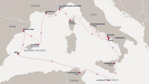 〈主要な寄港地〉 チビタベッキア/ローマ / ナポリ / カプリ島 / カルヴィ/コルシカ島 / ヴィルフランシュ=シュル=メール / マルセイユ / マホン / バルセロナ / イビサ / ラグレット / バレッタ / タオルミーナ/シチリア島 / ソレント
