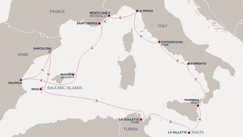〈主要な寄港地〉 バルセロナ / イビサ / ラグレット / バレッタ / タオルミーナ/シチリア島 / ソレント / チビタベッキア/ローマ / ピサ/フィレンツェ/ラスペツィア / モンテカルロ / サントロペ / マホン / バレンシア